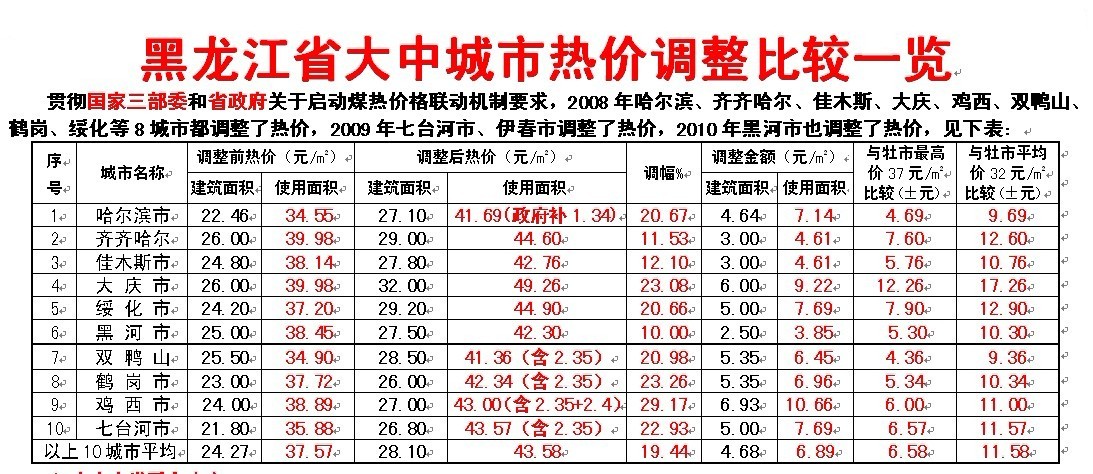 貫徹國家三部委和省政府關(guān)于啟動煤熱價格聯(lián)動機(jī)制要求,2008年哈爾濱、齊齊哈爾、佳木斯、大慶、雞西、雙鴨山、鶴崗、綏化等8城市都調(diào)整了熱價,2009年七臺河市、伊春市調(diào)整了熱價,2010年黑河市也調(diào)整了熱價,見下表: